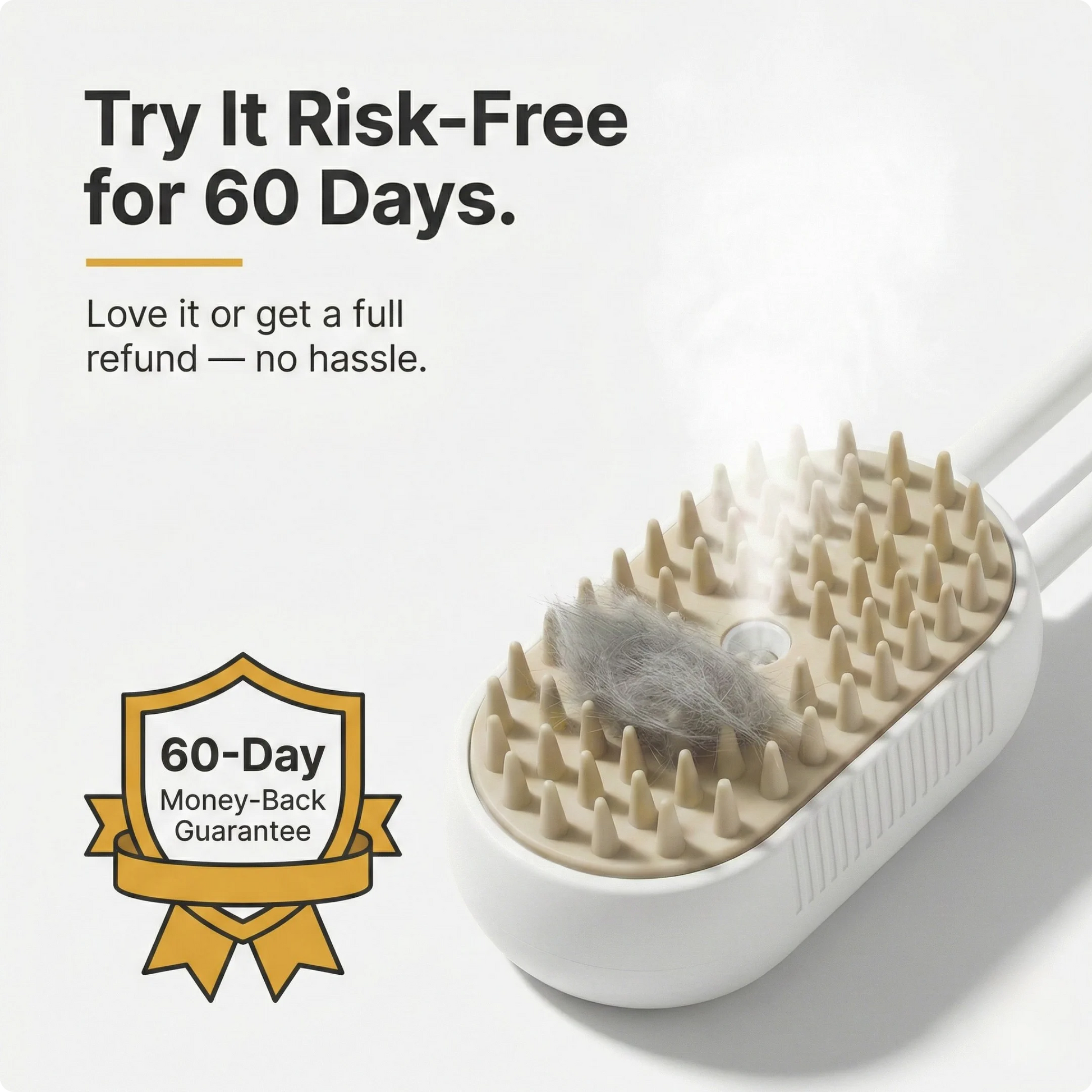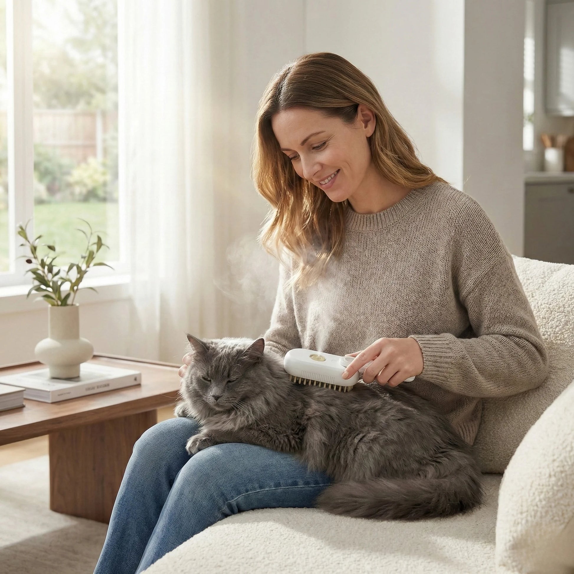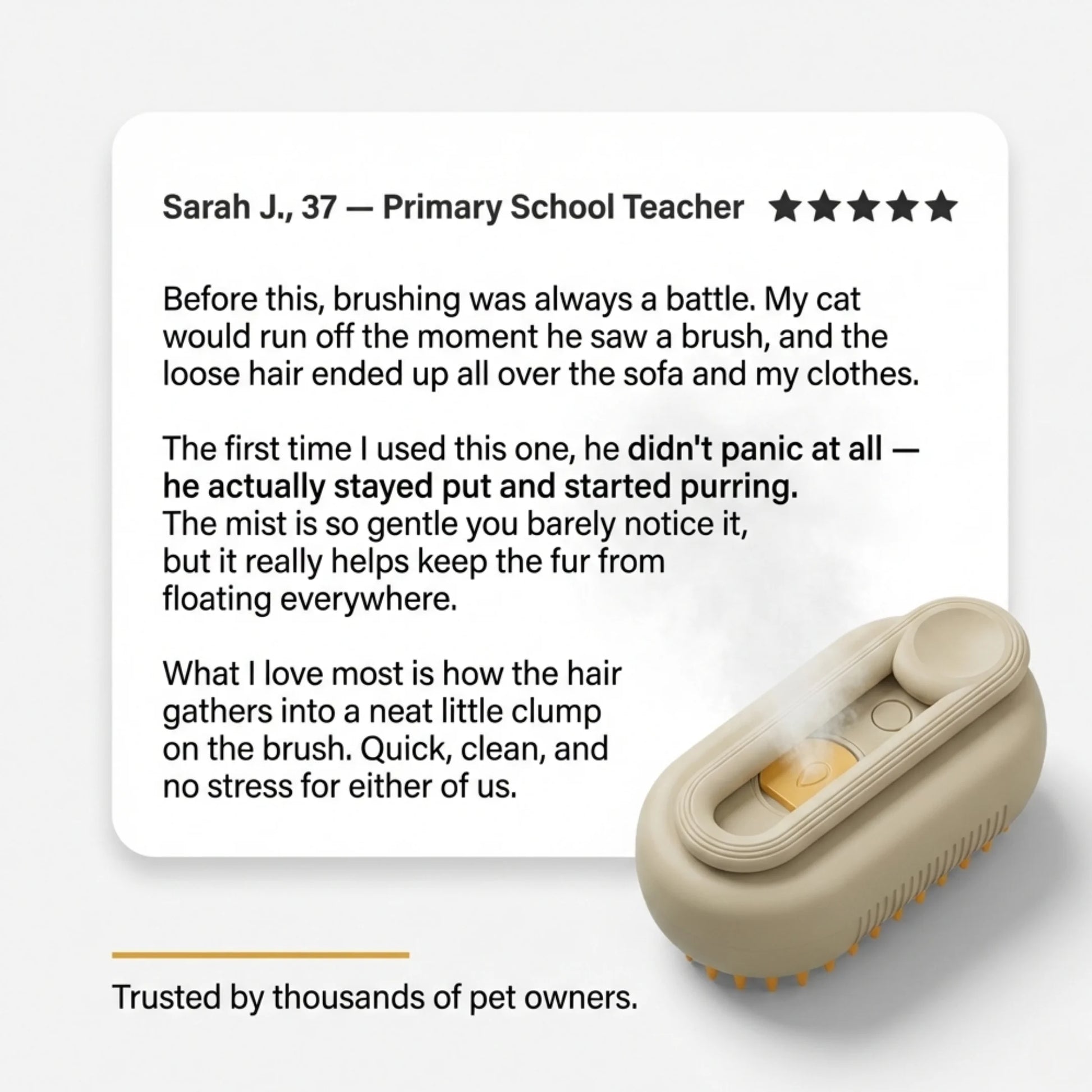Tip: Let your pet sniff the brush first, start with short sessions, and reward with treats. If your pet is sensitive, use the mist in short bursts.