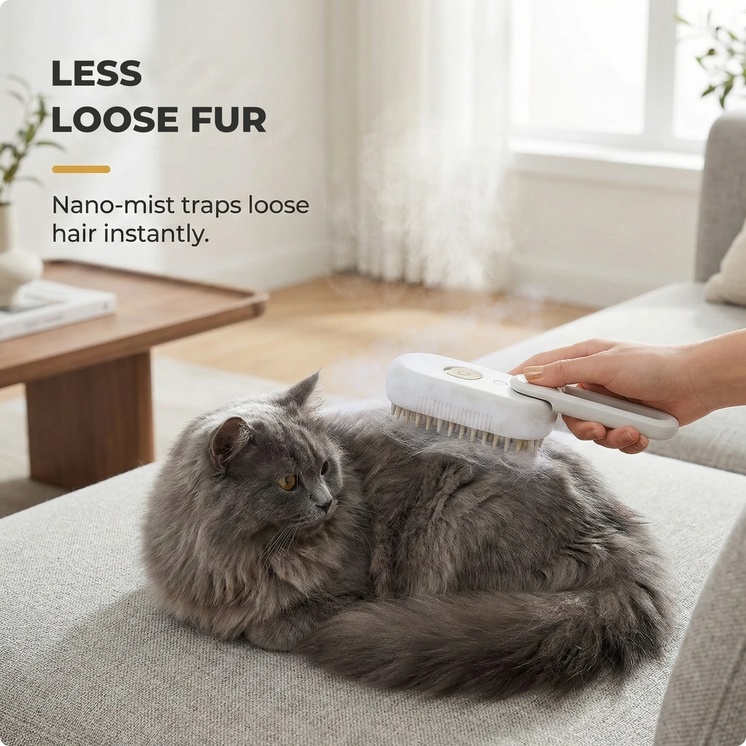 Forget hair on your sofa. The mist dampens the coat, weighing down loose fur so it clumps perfectly into the brush.